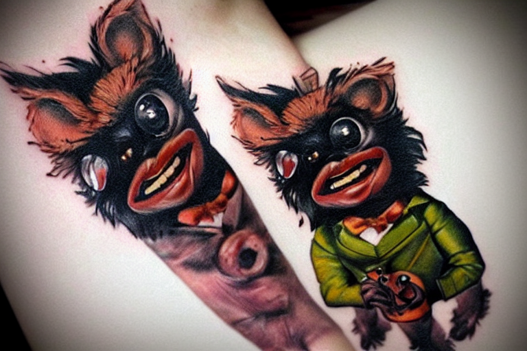 Prompthunt A Cute Hyper Realistic Tattoo Of Gizmo From The Movie Gremlins Wearing A Wedding Suit And Looking Happy Neo Modern Tattoo School Tattoo Dslr
